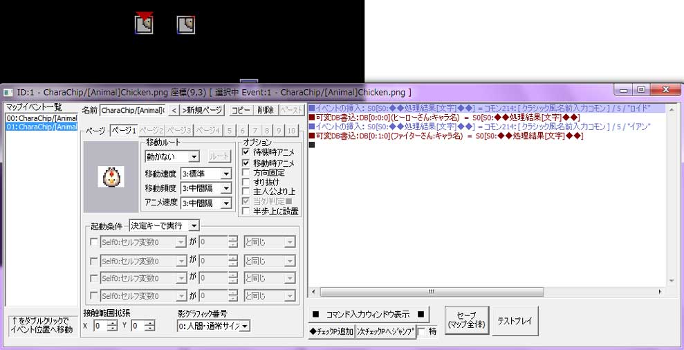 二人のキャラクターの名前を決め、 其々をコモンデータの主人公データベースの1と2に割り当てる予定です。 シナリオを書くときは\cdb[0:0:0]と\cdb[0:1:0]で表しつつ書こうと思います。 二匹目のテストにわとりにイベントを入力します。 名前を変更するキャラクターは二名です。